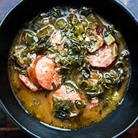 This might not be the traditional gumbo you’ll find in New Orleans, but that doesn’t make it wrong! In this gumbo pot, it’s all about the pork products! Incorporating ham hock and smoked andouille sausage into a broth packed with tons of assorted greens. Get the full recipe here.