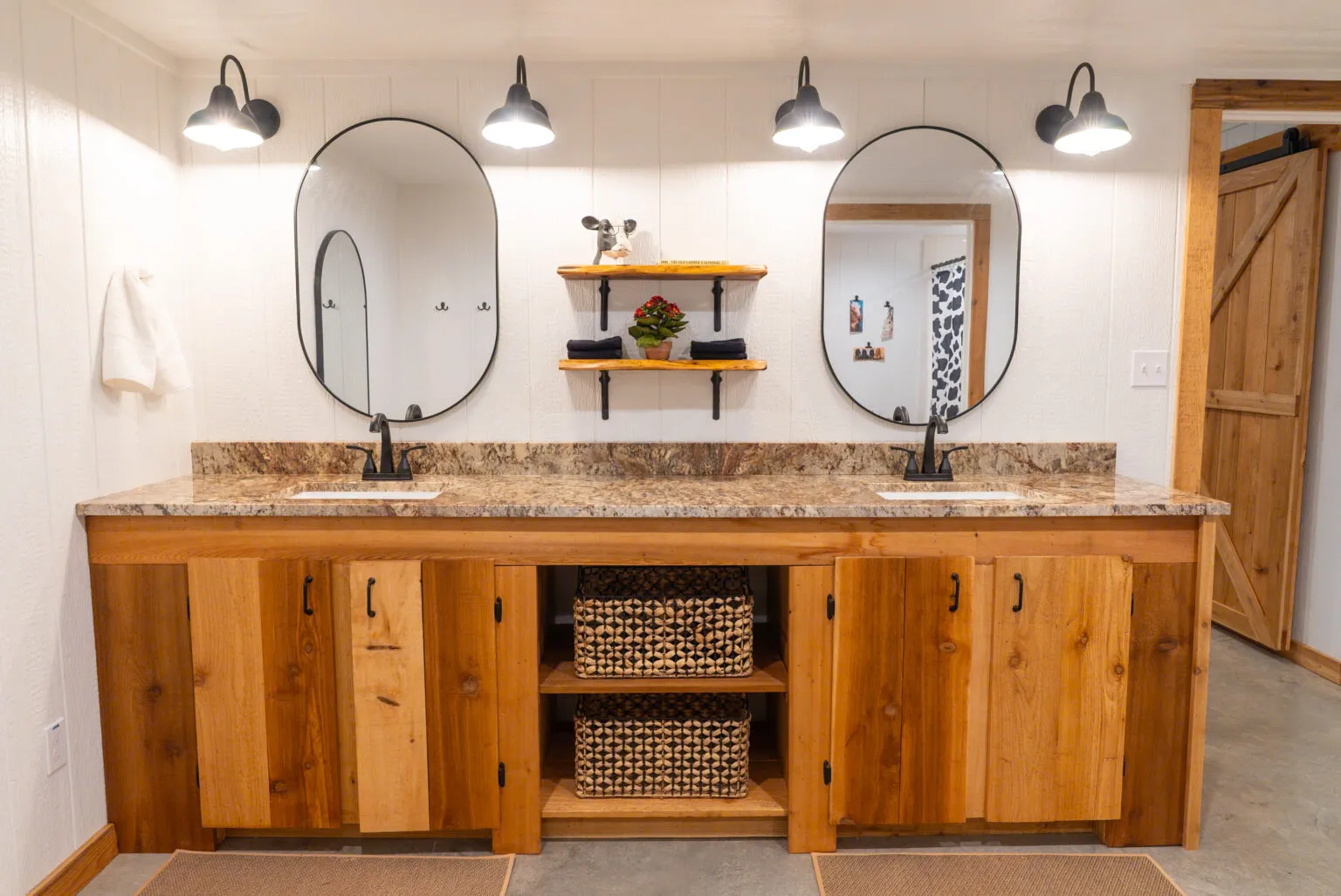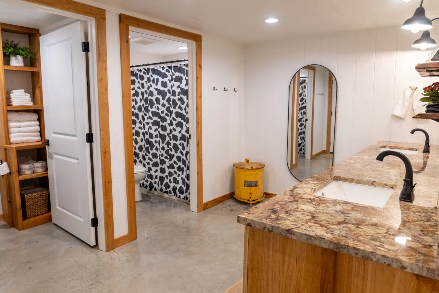 Two full bathrooms, a large vanity area, and farmhouse-style finishes
