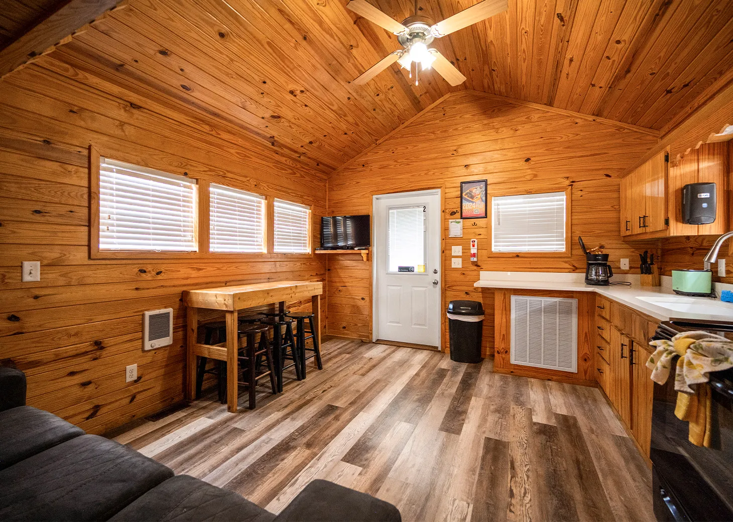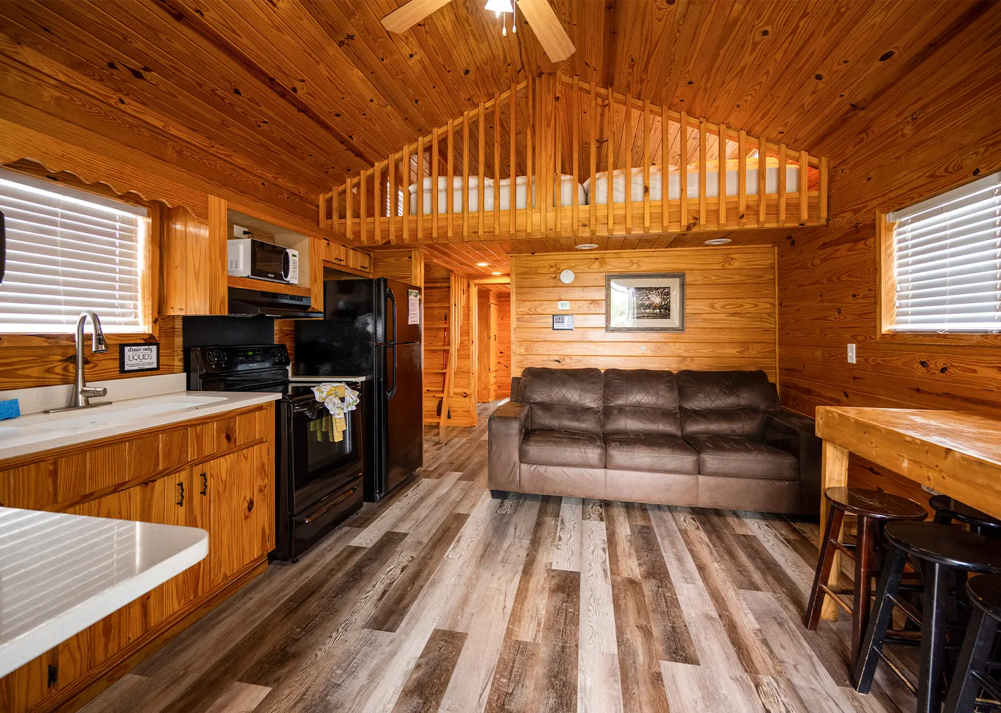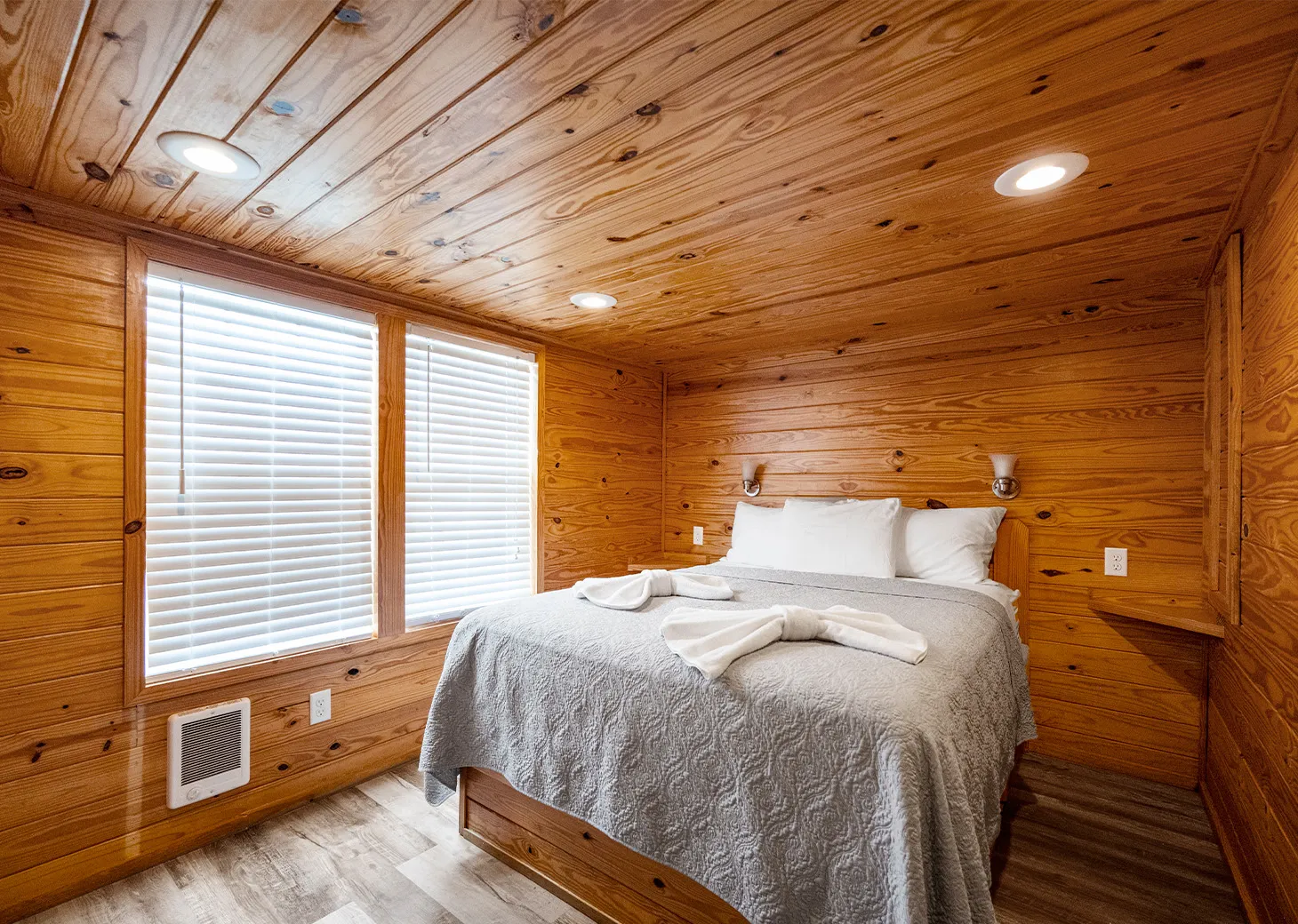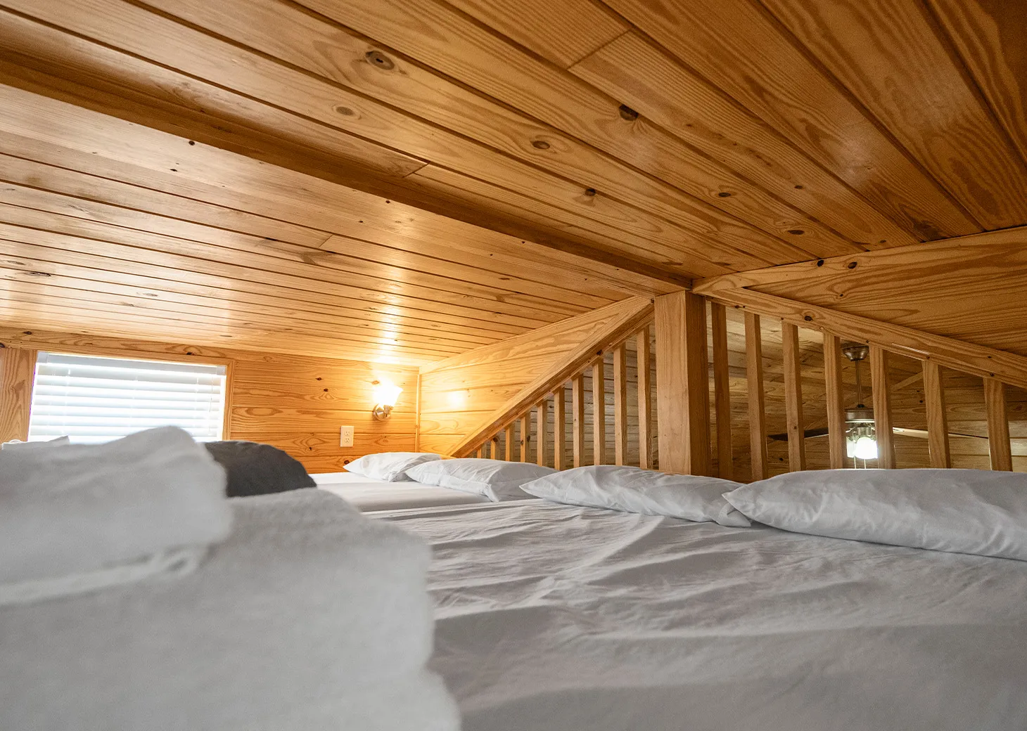 *Cabins accommodate up to 12 guests. Included: bedroom with queen size bed, loft with 4 queen size beds, 1 full-size air mattress in the closet of bedroom, full bathroom, fully furnished kitchen (dishes, silverware, glasses, pots & pans), couch, microwave, refrigerator, oven and stove (no oven in ADA cabins), coffee pot, toaster, satellite TV, outdoor porch with table and chairs, fire pit, picnic table, A/C and Heat.
