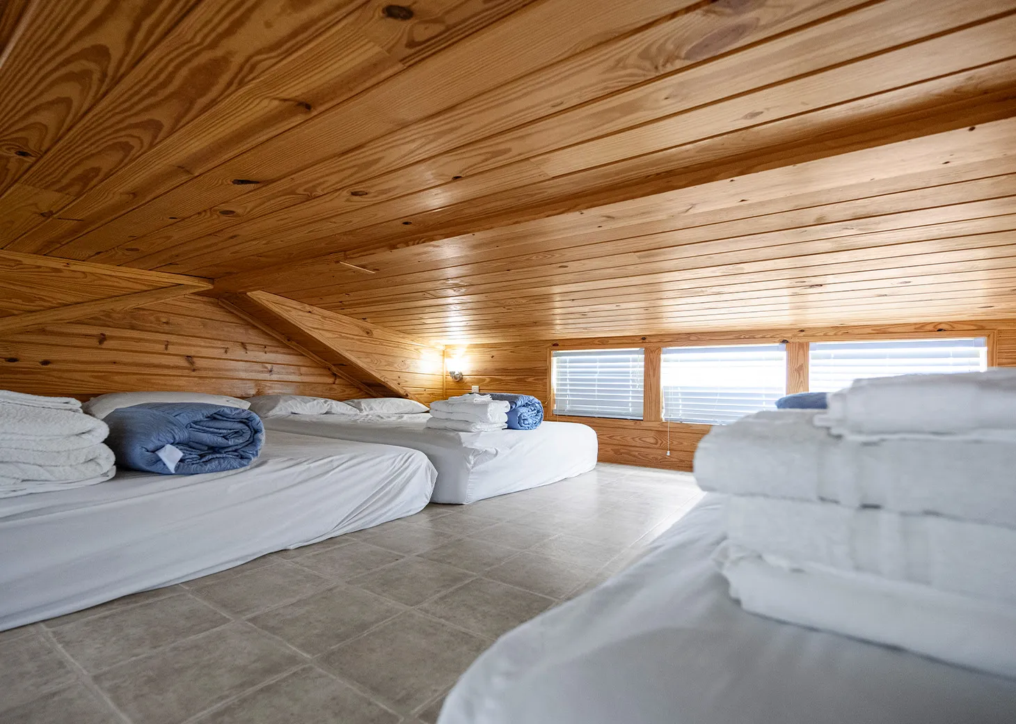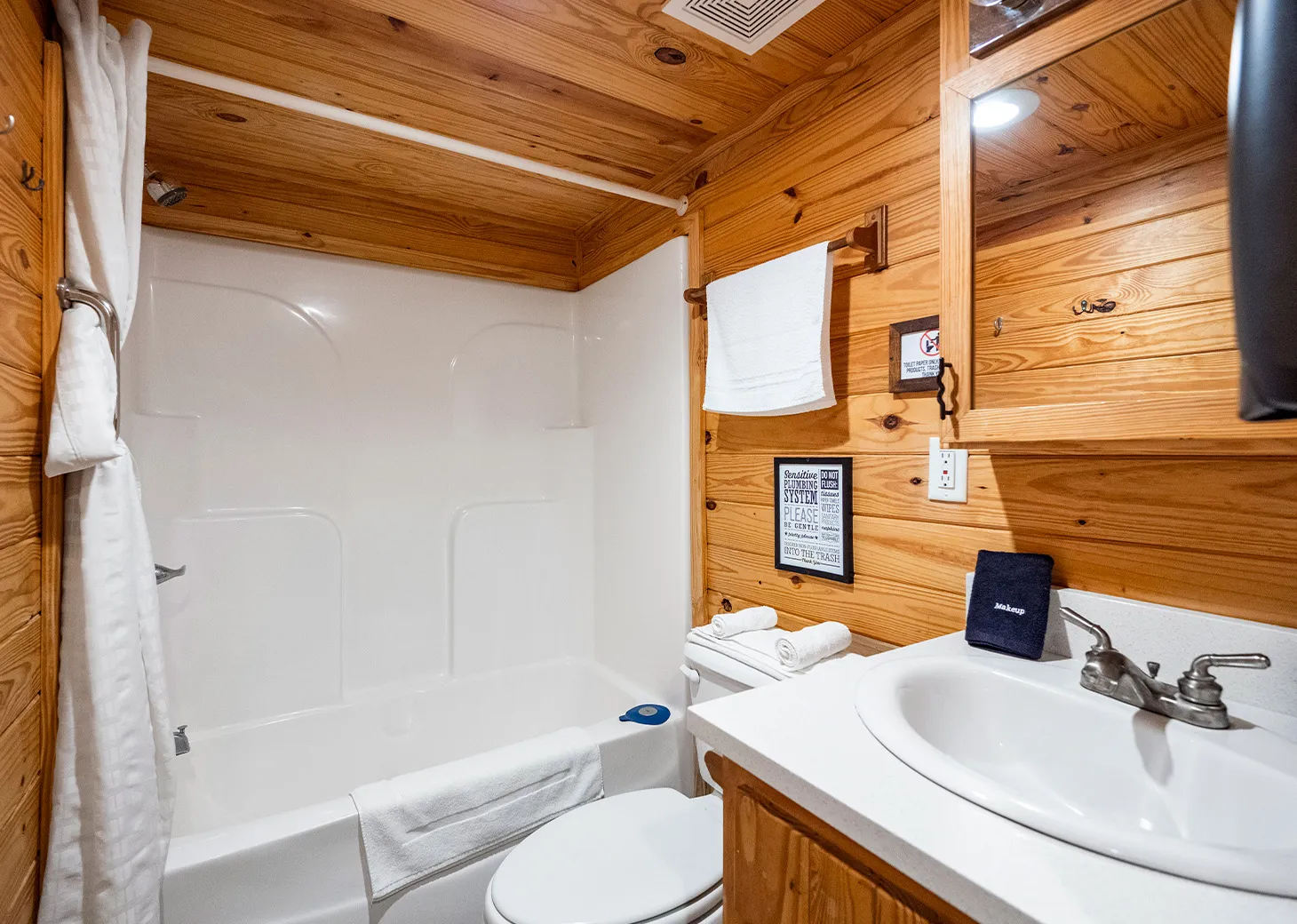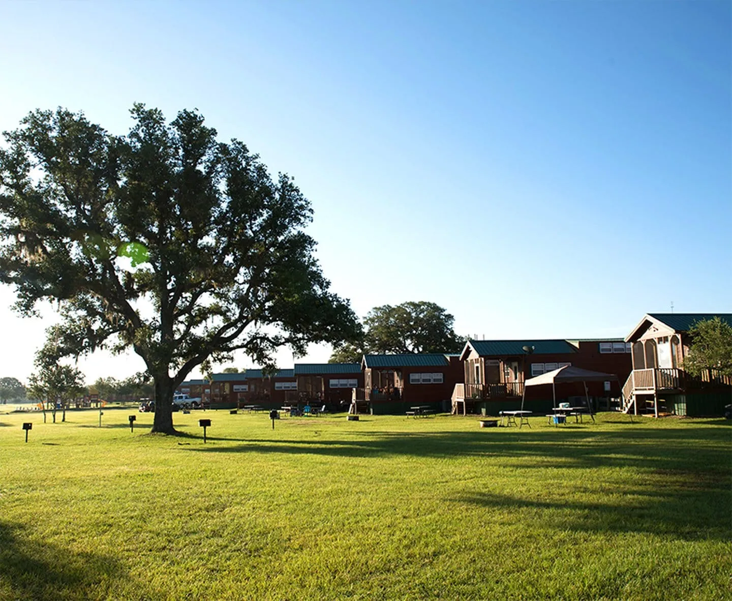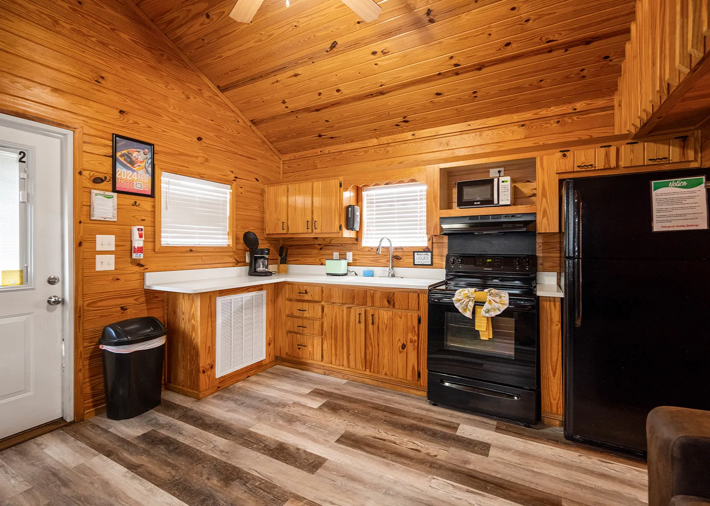 *Cabins accommodate up to 12 guests. Included: bedroom with queen size bed, loft with 4 queen size beds, 1 full-size air mattress in the closet of bedroom, full bathroom, fully furnished kitchen (dishes, silverware, glasses, pots & pans), couch, microwave, refrigerator, oven and stove (no oven in ADA cabins), coffee pot, toaster, satellite TV, outdoor porch with table and chairs, fire pit, picnic table, A/C and Heat.