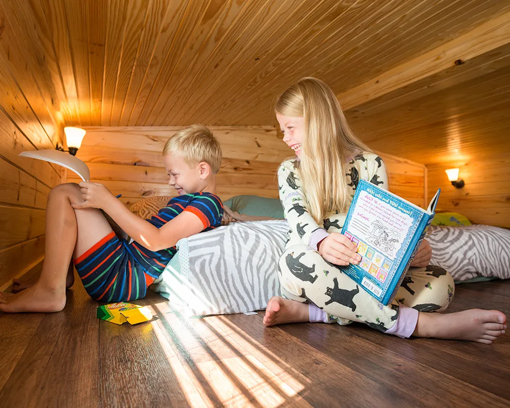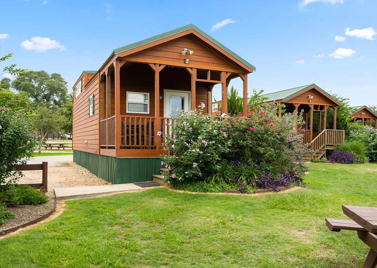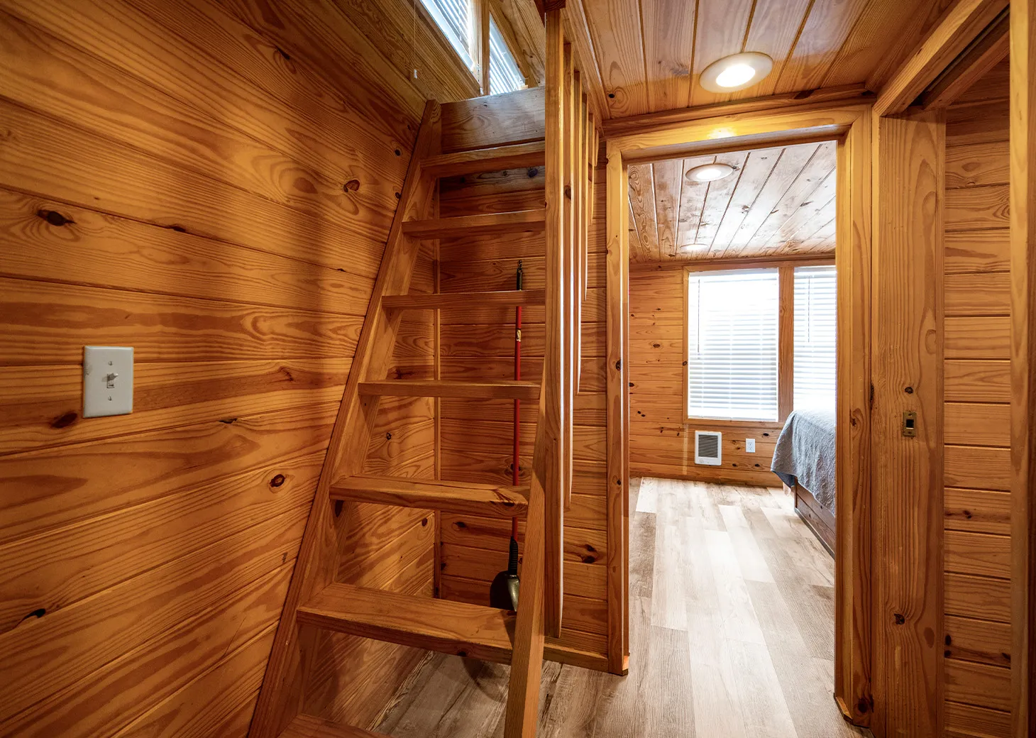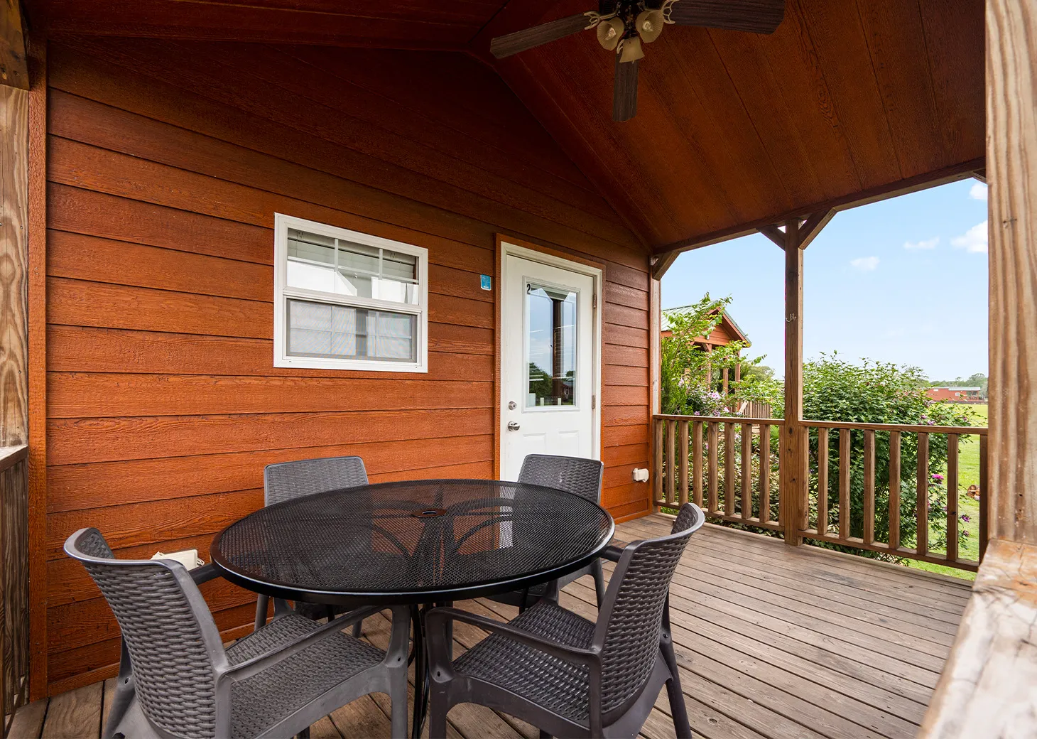 *Cabins accommodate up to 12 guests. Included: bedroom with queen size bed, loft with 4 queen size beds, 1 full-size air mattress in the closet of bedroom, full bathroom, fully furnished kitchen (dishes, silverware, glasses, pots & pans), couch, microwave, refrigerator, oven and stove (no oven in ADA cabins), coffee pot, toaster, satellite TV, outdoor porch with table and chairs, fire pit, picnic table, A/C and Heat.