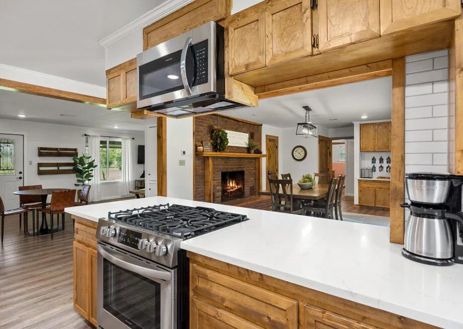 🍽️ Fully Furnished Kitchen: Cook up your family’s favorites in the well-stocked kitchen with dishes, silverware, glasses, pots, pans, a microwave, refrigerator, oven and stove, coffee pot, and toaster.
