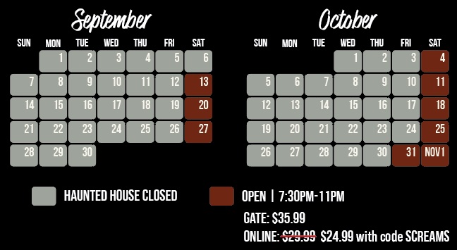Dates: Saturday September 13th- November 1st + HALLOWEEN, October 31st